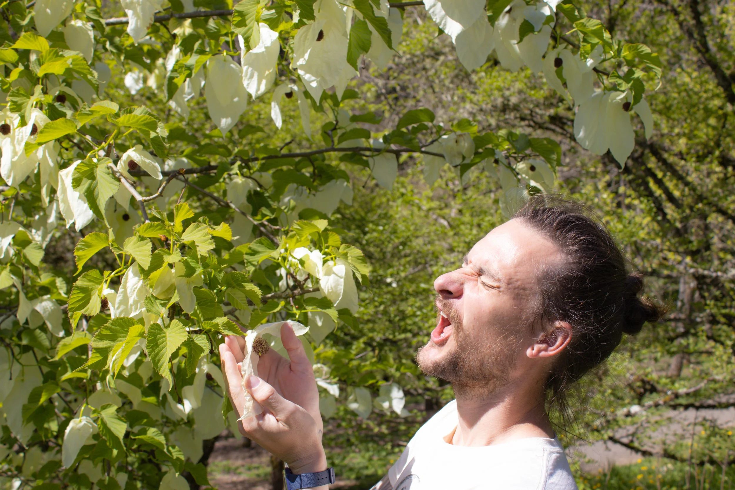 Casey putting the kerchiefs of the handkerchief tree (or dove tree, Davidia involucrata) to good use.